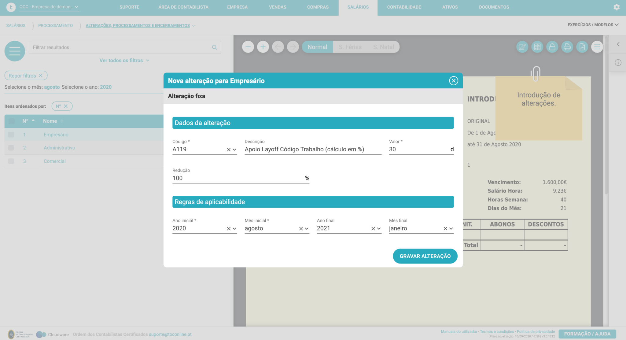 No processamento, deverá introduzir uma alteração no(s) colaborador(es) enquadrados, selecionando um dos abonos acima identificados.