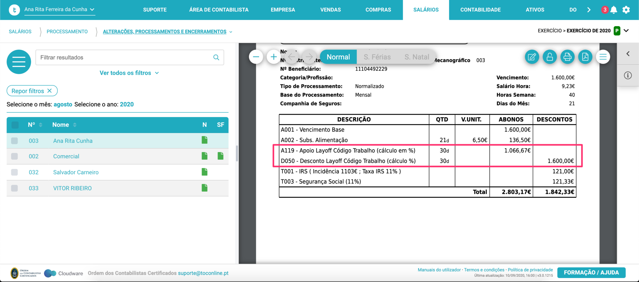 • A120 – Apoio Layoff Código Trabalho (cálculo em horas)